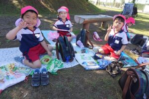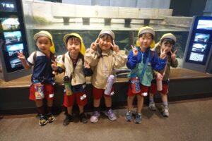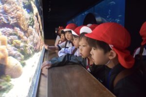 バスに乗ってマリンピアに行ってきました!朝からお弁当、バス、マリンピアに楽しみで待ちきれない様子の子どもたち。いろいろな魚たちに夢中で、お友だちと手をつなぎながら会話が弾んでいました。イルカショーも「わぁ~!」と歓声を上げたり、拍手をして嬉しそうに見ていました。何よりお楽しみのお家の人が作ってくれたお弁当も外の芝生で食べると一段と美味しかったね!!