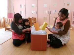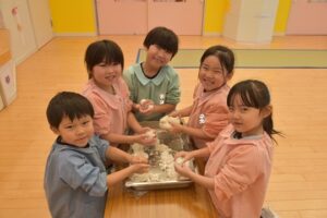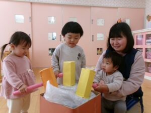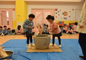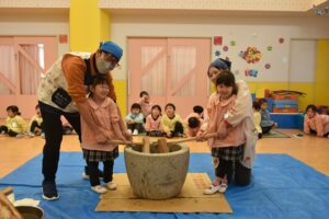 毎年恒例のおもちつき。小さいクラスの子も目を丸くしながら、もちをつく様子を見て、お部屋でもちつきごっこを楽しみました。3・4・5歳児さんは実際に順番にもちをつく体験をして、見ている子どもたちの「よいしょ!」の掛け声にも熱が入っていました。杵についたもちが伸びると「わぁぁぁ~!すごい伸びてる~!」と大歓声!もちをついた後はもちに触れて感触を楽しんでいました。