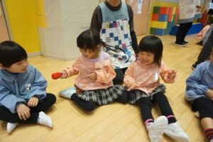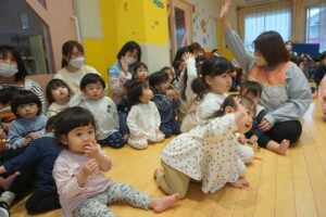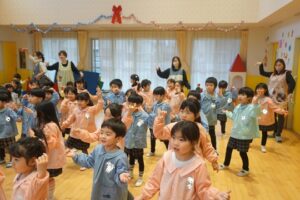 子どもたちで共同制作したクリスマスツリーが玄関を彩る中、クリスマス会ではサンタクロースとトナカイと…テレビで流行っている歌手が登場!みんなで『好きすぎて滅』を踊って盛り上がりました!クリスマスクイズや異年齢でのプレゼント渡しゲームなども楽しみ、笑顔いっぱいで楽しいひとときを過ごしました。メリークリスマス!