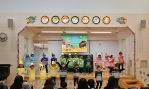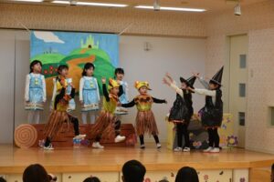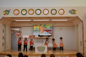 発表会では、普段から楽しんできた劇遊びをおうちの方にも見てもらいました。3歳児ベル組はわたなべさんという絵本のお話を題材に、4歳児ハート組はクレヨンのだいぼうけん、5歳児ダイヤ組はオズの魔法使いを演じました。歌や踊り、子どもたちが考えたいろいろな表現をまじえて、子どもたちもお友だちと一緒に役になりきって楽しんでいました。ダイヤ組はメロディオンや楽器の演奏も披露し、ケセラセラの難しいリズムも気持ちを合わせて演奏していました。