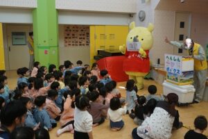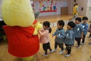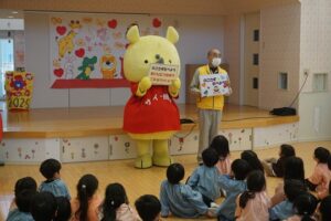 3月2日 ごみリサイクル出前授業 2026年3月3日 新潟市の方が来園し、ごみリサイクルについてDVDを見たり、楽しいクイズをしたりして子どもたちも興味を持って参加しました。サイチョくんにも会えて嬉しそうにタッチしていました。