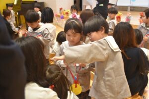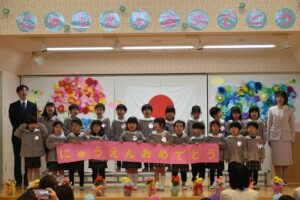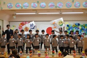 あいりすこども園では3歳児クラスで入園式を行っています。本日、新入園児を含め親子で入園式に参加し、年長ダイヤ組が歌や体操で盛り上げてくれました。少し大きい制服を着て嬉しそうにお家の人と出し物を見て楽しんでいたベル組さん。これからたくさん遊ぼうね!